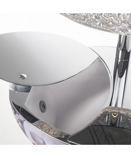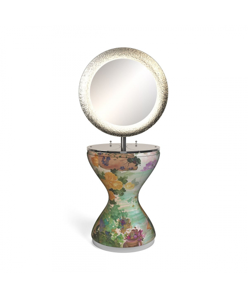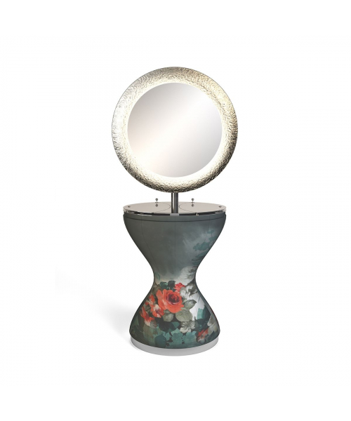 Зеркало парикмахерское "Miss Beauty" - со съемной тканевой обшивкой, круглым зеркалом с изогнутым назад элементом, отделанным листовым серебром. Светодиодная подсветка, электрическая розетка / USB-порт, двойной ящик для инструментов, выдвижной держатель для фена.