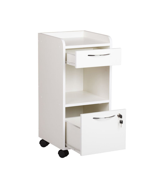 Тележка представляет собой тумбу на колесных опорах с одним открытым отделением и двумя выдвижными ящиками, один из которых с замком. Цвет ламинированного ДСП любой из представленных на сайте.
