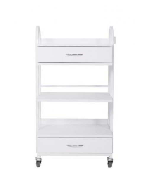 Столик для профессионального использования на металлическом каркасе белого цвета с одной полкой из ЛДСП, двумя выдвижными ящиками и специальным креплением для лампы-лупы. Столик оснащен колесиками, благодаря которым его легко можно передвигать и ваши инструменты всегда будут под рукой. Идеально подойдет для педикюрного, косметологиче- ского и массажного кабинетов.