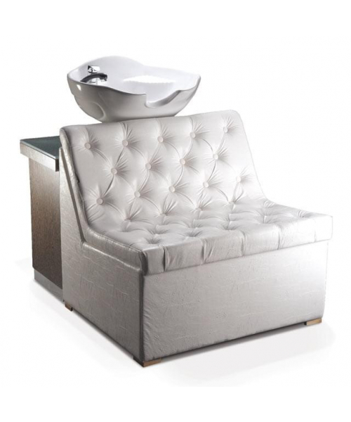 Широкое кресло очень эффектно выглядит и больше похоже на небольшой диванчик. Белоснежная мойка отлично сочетается с контрастной по цвету полкой, на которой мастер может удобно разместить полотенца и другие предметы.Качественные материалы и обивка позволяют мастеру не беспокоится о возможном загрязнении изделия. Все материалы легко очищаются при помощи обычных средств.